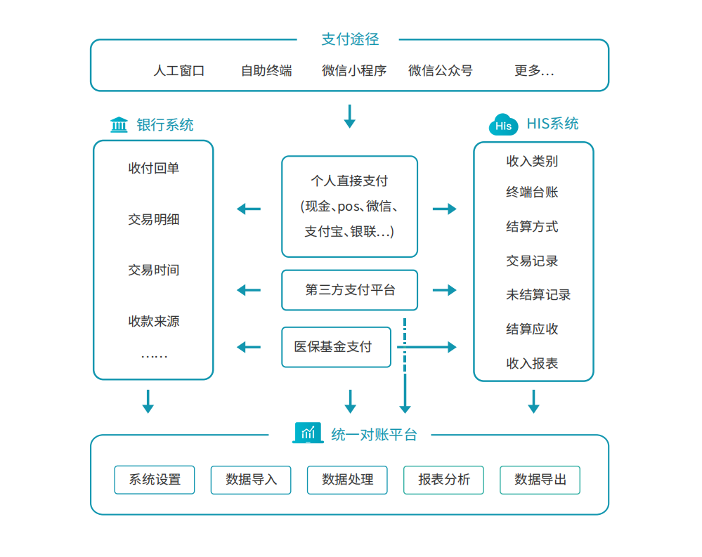 统一对账平台记录医院所有的交易记录,与第三方交易渠道进行交易记录的对账,与医院HIS内部的收费系统进行对账,确保财务账的准确性;系统平台提供异常账、单边账的自动处理及每日财务对账后差错账的完善处理机制,通过权限设置可分配不同角色管理账目,降低财务工作人员的工作复杂度,提高工作效率。